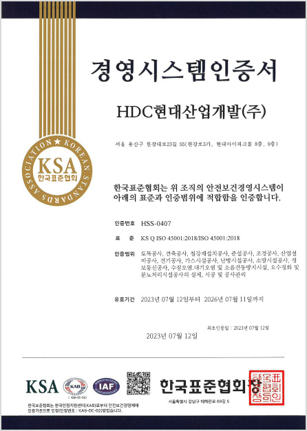 - HDC현대산업개발(주)의 모든 임직원은 상기 방침을 숙지하고 실천하여 효율적인 안전보건 경영시스템이 실행되도록 최선을 다한다.