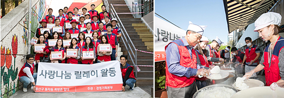 또한, 본사 소재지인 서울 용산지역을 중심으로 연탄배달, 거주환경 개선 벽화그리기 봉사 등 다양한 봉사활동을 펼치고, 사내 각 본부별로 릴레이 봉사활동도 꾸준히 이어가고 있습니다.