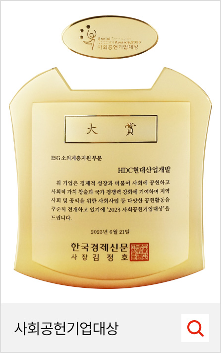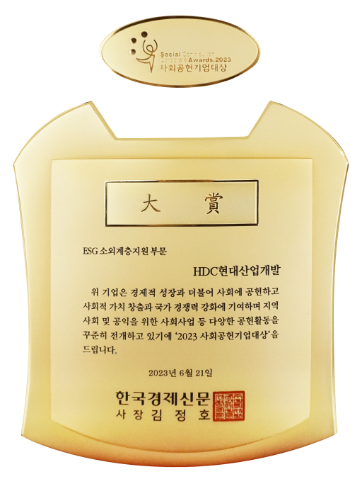 HDC현대산업개발은 ESG경영 강화 차원에서 지역사회발전과 소외계층 지원을 중심으로 적극적인 사회공헌 활동을 이어간 점을 인정받아 한국경제신문 '2023 사회공헌기업대상' ESG&소외계층지원 부문 대상을 수상했습니다.