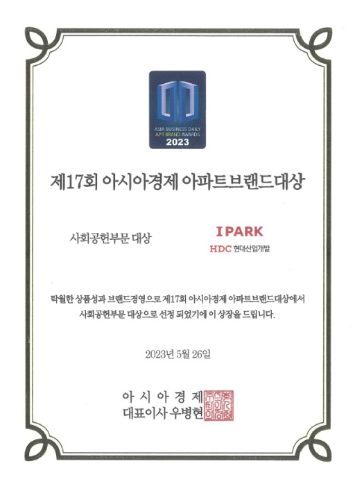 IPARK현대산업개발은 상생경영 강화를 위한 지역사회 공헌과 협력회사 동반성장에 힘써온 결과로 아시아경제 아파트브랜드대상 사회공헌 부문을 수상했습니다.